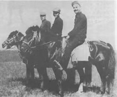 《红星照耀中国》插图。斯诺(右)和胡金魁(中)、李长林三人一起骑马的合影。