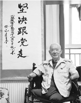 初夏的午后,记者来到四川省革命伤残军人休养院周全弟的家里,一进门就被墙上的书法作品所吸引,上书“坚决跟党走”五个大字,落款是“四肢截除壹级伤残军人周全弟抱笔书”。两室一厅的屋子简单整洁,89岁的周全弟坐在轮椅上腰板挺得笔直,声音洪亮。“战友们往前冲,我眼睁睁看着,就是爬不起来,冲也冲不动,眼泪止不住掉。”那场战役已经过去73年了,战场上没能完成战斗任务是他一生的遗憾。