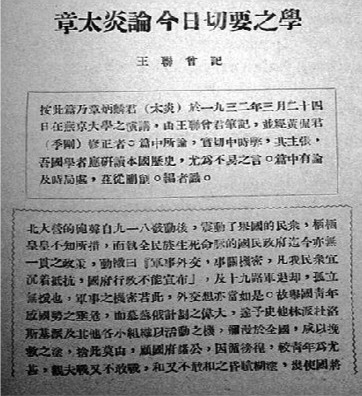 北大营的炮声自“九一八”发动后,震动了举国的民众,栖栖皇皇不知所措,而执全民族生死命脉的国民政府迄今亦无一贯之政策,动辄曰“军事外交,事关机密,凡我民众宜沉着抵抗,国府行政不能宣布”,及十九路军退却,孤立无援也……国府诸公,因循彷徨,较青年为尤甚,观夫战又不敢战,和又不敢和之昏瞆糊涂,几使国将不国,民族无以自存。太炎先生自沪莅平,目触时艰,深慨举国上下之彷徨无所适,尤痛青年学子不知今日切要之学安在,乃于民国二十一年(三月二十四日)在燕大反复申述史志为今日切要之学,以警惕今日学风之流放。篇中所论,实切中时弊,其主张吾国学者应研读本国历史,尤为不易之言,望我青年学子勿徒麻醉于异族之学说,以增加我国沦亡之速度也。全国青年其三思之!