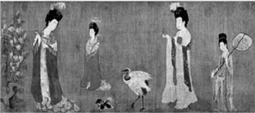 那是大唐长安的一个春夏之交,牡丹和辛夷花盛放的季节,几位贵族女性精心装扮一番后,便带着宠物和侍女出游了:她们梳高髻,画短眉,着宽幅大袖,在庭院中漫步、拈花、拍蝶、戏犬、赏鹤、沉思。簪花是这幅画有别于其他仕女画的一大特点,画中6位女子分别簪牡丹、海棠、荷花等鲜花,这正是唐代的一种“时髦”。《开元天宝遗事》记载:“长安仕女春时斗花,戴插以奇花,多者为胜。”