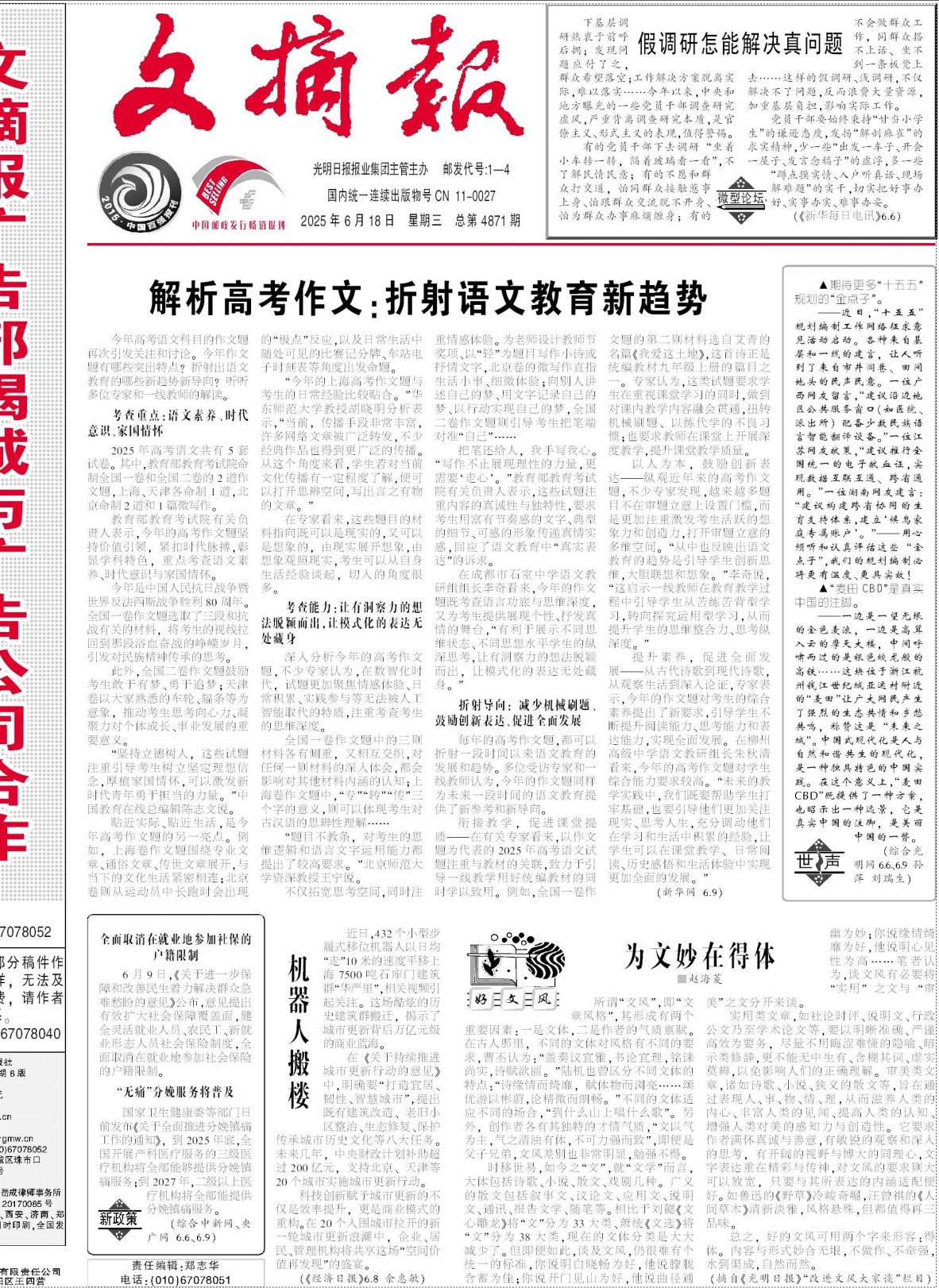 提升素养,促进全面发展——从古代诗歌到现代诗歌,从观察生活到深入论证,专家表示,今年的作文题对考生的综合素养提出了新要求,引导学生不断提升阅读能力、思考能力和表达能力,实现全面发展。在柳州高级中学语文教研组长朱秋清看来,今年的高考作文题对学生综合能力要求较高。“未来的教学实践中,我们既要帮助学生打牢基础,也要引导他们更加关注现实、思考人生,充分调动他们在学习和生活中积累的经验,让学生可以在课堂教学、日常阅读、历史感悟和生活体验中实现更加全面的发展。”