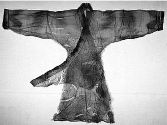这件衣服为何叫素纱单衣?其准确的名称应是“素纱襌衣”。所谓襌衣,就是没有衬里的衣服。素纱属于高档衣料,在周朝时多用作上层贵族袍服的衣里料。素纱单衣的衣料为没有染色的平纹方孔丝织物素纱。经测算,其用纱料约2.6平方米,若除去衣领、衣袖、衣襟边缘的绢,主体部分重量仅20余克,可谓“薄如烟雾,轻若无物”。