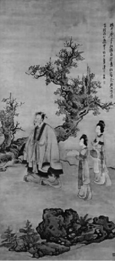 (明)陈洪绶绘《升庵簪花图》轴。图绘杨慎在云南醉后以白粉涂面,髻上插花,游行于市中。