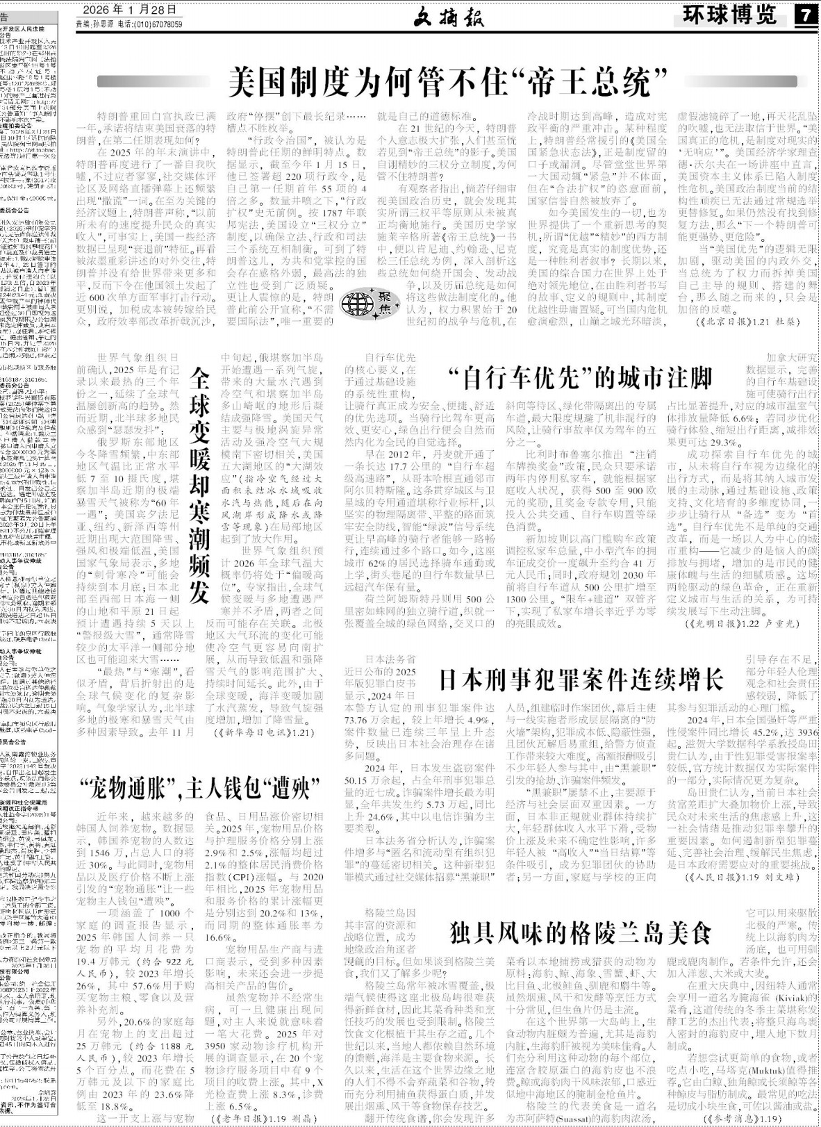 世界气象组织预计2026年全球气温大概率仍将处于“偏暖高位”。专家指出,全球气候变暖与多地遭遇严寒并不矛盾,两者之间反而可能存在关联。北极地区大气环流的变化可能使冷空气更容易向南扩展,从而导致低温和强降雪天气的影响范围扩大、持续时间延长。此外,由于全球变暖,海洋变暖加剧了水汽蒸发,导致气旋强度增加,增加了降雪量。