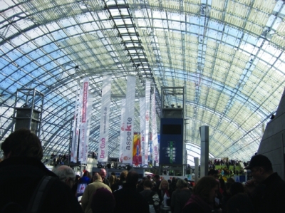 3月19日,天气竟出乎意料地好起来了,春阳虽说不上是高照,蓝得让人不舍的天空中亦有云朵浮动,然而毕竟是春意盎然了。我陪同专为此次书展到访的诗人王家新乘上16路有轨电车,一路哐当哐当地向着位于市郊的莱比锡展览会摇晃过去。莱比锡地处中欧交通枢纽,早有举办博览会的优良传统,其市标之一即为两个上下相叠的大写的“M”(Muster-Messe,意为“模范博览会”,也有译为“样品博览会”的),我们远远地就看见了这个在高塔上旋转的标识。莱比锡的各种展览以前一直在离市区较近的老展览馆举行,两德统一后在城市北郊修了这个新馆,钢混结构、玻璃外墙、玻璃拱顶,中央区两侧有玻璃甬道通向五个分展区。整体给人的感觉虽然单调,但是实用、功能性强,也相当精准,这就是“德国制造”,如果允许我这么陈词滥调一把的话。