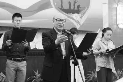 图为朗诵艺术家殷之光领衔北京朗诵艺术团在台上表演。 图/文 夏琪