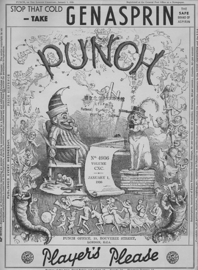 报馆云集的弗利特街旁的一条岔路上,《笨拙》的旧址是一片凄凉和萧索。不再有繁忙的运送纸张和新杂志的大卡车,不再有来来往往前来聚餐的文人画士,只有寒风吹着地上的纸屑,红砖墙上是一片冷峭。半年以前,《笨拙》停刊了,四月八日那最后一期封面上便是这样一街零落秋景,夕阳西下,暮色苍茫,老态龙钟的笨拙先生鼻更弯、背更驼,带着他的朱迪他的狗,一步三回头而去。手提箱上印着的是“太阳下山,我归去也”。
