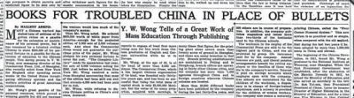 《为动荡的中国提供书籍而不是子弹》由《纽约时报》驻中国首席记者哈雷特·阿班(HallettAbend)在美国采写。1930年4月到5月,他刚好回美国休假,和王云五在美国访问的时间重合。《纽约时报》在两个月之内对商务印书馆进行了两次报道。第一次报道由阿班采访于3月15日的上海,发表于4月13日,题为《中国推崇书籍为文化之根本》(China Hails Books as CultureBasis),着重提到了《万有文库》的出版发行情况。《为动荡的中国提供书籍而不是子弹》则是对王云五本人的采访稿,采访日期是王云五离开美国去英国之前,发表于当年的6月1日。在《岫庐八十自述》中,王云五提到:“我在离美赴欧以前,曾受《纽约时报》记者Abend之访问,畅谈商务印书馆情形,及我主编之万有文库二千册事。该记者认为如此大规模之图书,在世界上得未曾有,竟以巨幅之叙述,为我宣传,并将该报寄我驻英使馆转交我。”此“Abend”即“哈雷特·阿班”。不过王云五没提到报道的具体日期,至今也没有报纸的原件以及复印件或者学者的有关论述来证明这一点。而笔者根据“Abend”这个线索在《纽约时报》数据库检索到了这篇文章,佐证王云五此言不虚。在商务印书馆创办将满35周年之际,它能引起《纽约时报》的两次关注,证明它又发展到了一个新的高峰。单从商务印书馆雇用的员工而言,1930年是1911年的五六倍之多。