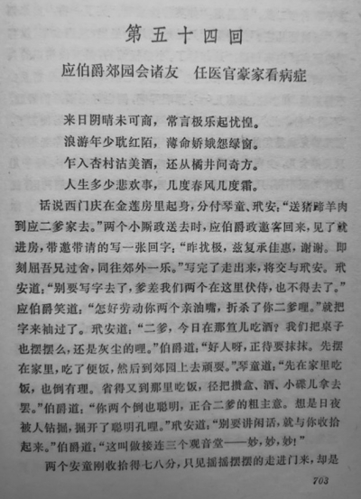 《金瓶梅》第五十二回到第五十七回,据说“祖本”有缺漏,有观点认为,现成的这些章回里有些文字为后人所补。更有甚者,另有观点认为这几回尤其是这第五十四回“不堪卒读”。从以上的简要评说来看,完全不是这码事,相反的倒是,正是有了“词话本”的这第五十四回,我们才可以由此继续看下去。看下去的原由至少两个方面:其一,西门庆与西门庆诸友的最后走向,已经在此郊园聚友时成形;其二,李瓶儿的大限将止,而李瓶儿的死期,则预示着西门府上的开始败落。虽然,第五十四回在整部《金》中谈不上重要关节,但设想,倘若没有了这第五十四回,《金》会是一个什么样子呢?校点“绣像本”的王汝梅对此也说过:“词话本第五十三、五十四两回与前后文脉络贯通,风格也较一致,而崇祯本这两回却描写粗疏,与前后文风格亦不太一致”。