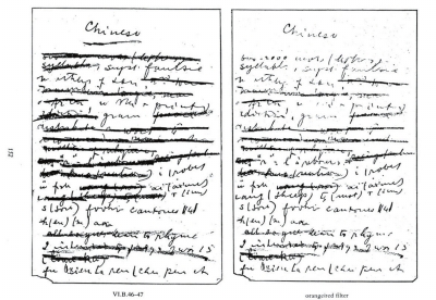 乔伊斯的笔记对破译中文有什么用?这要从其读写习惯说起,乔伊斯阅读甚广,笔记简洁而恒久,凡某词写入小说,他就用不同颜色的蜡笔划去(尽管少数情况下未严格遵守),以保证自己不重复用。晚年他眼疾厉害,请秘书将未划去的笔记誊到另外的大本子上,这样继续工作。学者通过高清图片辨认其笔迹,特别是通过不同颜色过滤等技术手段,力图恢复为彩色蜡笔划掉的语汇,再根据各方信息追溯该词可能来自哪本书或哪一期报纸的哪一页,并给出它在小说及大英博物馆手稿中的具体位置。可以想象,这对学者的知识结构要求极高——不仅《守灵夜》须烂熟于心,会多门外语,且常年浸淫于乔伊斯的时代,看他可能看的经典、书报和流行文化。猜测即试错,可能万般尝试而一无所获,又由于大部分文本乃乔伊斯自编的混成词(portmanteauwords),网络搜索功能也不能直接帮上忙。笔记注释工作虽艰辛,其成果却令人欣慰。国内很难见到乔伊斯的影印笔记,根据西方学者的《乔伊斯档案》书评,外语词汇主要集中于VI.B.39、40、46三本笔记。其中,仅46号笔记本已转写并出版,即上段提到的罗斯编辑的《乔伊斯的索引手稿》。可喜的是,其中包含中文笔记。