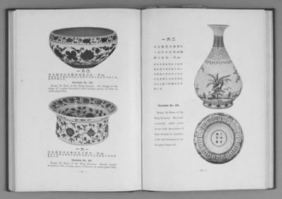 1935年4月,“伦敦中国艺术展览上海预展会”在上公共租界仁记路东口的中国银行旧址室内正式公开展览。按照筹委会“依艺术史上发展次第作有系统之展览”的决议,展览会分设6个陈列室,以青铜器、书画、瓷器和善本图书等分类展览,各类展品又以年代为序布置。第一陈列室为明清书画、折扇、织绣。屋内以木条搭成高约一丈、厚约尺半之架,上覆以灰黄色之布,宛若厚墙,书画即悬挂其上。书画前设置木栏,距书画约2尺,以便参观者凭栏观赏。折扇、织绣则均置于特制铁制玻璃橱。第二陈列室为唐、五代、宋、元书画;第三陈列室为青铜器;第四、五陈列室为瓷器;第六陈列室为善本图书、玉器、景泰蓝和剔红。第三、四、五、六陈列室内均设置特制铁柜玻璃橱,多数以厚玻璃分隔上下层,每层置手册、瓷器、青铜器等。