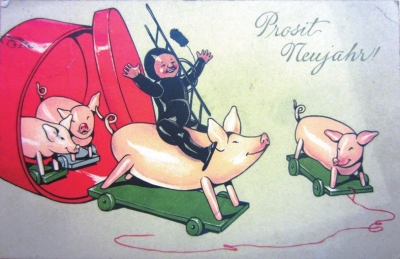 “Glücksschweinchen“.Ges.gesch.(迈森与布赫莱比锡艺术家明信片系列之1621“运气小猪”。最后的Ges.gesch.是gesetzlichgeschützt[受法律保护,亦即“版权所有”的意思]的缩写)