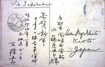 作为弟子辈的石桥于1911年从德国寄给内藤这张明信片时,内藤正在京都大学教授东洋史。从1907年一直到1926年,内藤都在京都大学任教,他担任京都大学东洋史讲座教授20年,期间与他的同僚狩野直喜(KanoNaoki,1868—1947)、桑原隲蔵(KuwabaraJitsuzō,1871—1931)创立了著名的“京都学派”。