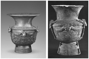 此外,淮河流域和长江下游的文化也可以通过长江中游这一中介影响三星堆文化。如1986年在三星堆1号祭祀坑出土的龙虎尊,与1957年在安徽阜阳阜南县发现的龙虎尊“撞脸”。从铸造技术特点和纹饰特点看,阜南龙虎尊的时代更早(大致在商代中期),三星堆出土的龙虎尊则是针对阜南龙虎尊的“高仿”。