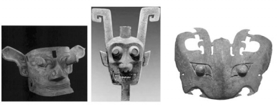 从二里岗文化和殷墟文化时期开始,北方的青铜文化向周边扩散,南方出现了几支青铜文化,如赣江流域的吴城文化、长江中游的盘龙城青铜文化、湘江流域的青铜文化以及长江上游的三星堆文化。这几支青铜文化都受到北方商文化的强烈影响,无论是技术特点还是青铜礼器的器形,都带有明显的商文化痕迹。同时,这几支青铜文化也有自身的特色,突出体现在青铜器的纹饰和宗教信仰方面。这些文化所创造的神人面具造型夸张,与中原文化异趣。