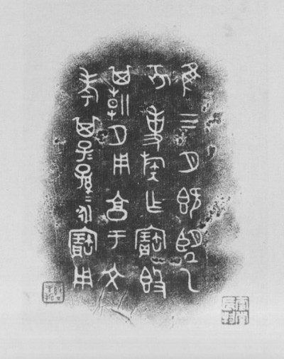 若是循此思路来看《澂秋馆汇集吉金文字拓本》中这个图案,它四周那个边框,通称“亚字形”图案。如郭沫若先生所云,自宋以来,或以为象宗庙之形,或以为两己相背,或以为两弓相背,这些设想,当然都有其合理的一面,不过我更愿意把它解作“垩”义,即古人办理丧事所居处的白壁垩室。按照这样的想法,圈围中间的图形,即为一人手执酒酉祭奠的形象,其与四围的亚字形边框,正相吻合。商周铜器本来就有很多是供祭祀之用,既然如此,又何必非用所谓“族徽”来解释不可呢? 当然我这只是一个“棒槌”在随便想想,当不得真。