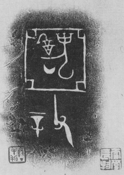 上面四周有边框那个部分,现在商周史和古文字学界普遍将其视作所谓“族徽”,亦即家族的标志符号。此说始倡自郭沫若先生,见上个世纪三十年代出版的《殷周青铜器铭文研究》卷一《殷彝中图形文字之一解》。但在郭沫若先生提出此说之前,沈兼士、王国维等人本来是把这类图形释