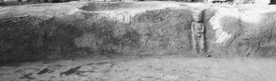附近还有一处不大的祭祀遗迹,一侧壁有二石牌柱,其中一个石牌柱边上有一双手扶阴茎的坐姿男人石雕,高达2.45米。而二石牌柱之间贴墙有一石轮形器,前面供桌上放置石盘、石罐等祭器,供桌一侧有和死亡相关的石雕秃鹫。显然这件轮形器才是主要祭祀对象,它或许象征苍天,或者通向天界或者另一世界之门?旁边的男性石雕应当只是“配享”的祖先形象。紧邻这个祭祀区的另一空间,里面堆积大量灰烬、动物骨骼等,墙壁下见有集中成套的盘、罐等石容器,不少石罐上面有复杂的几何形花纹,还有山羊图案,应该也是一处祭祀区。这个遗址已经发掘出大量人物和野驴、野牛、山羊、秃鹫、豹等动物的雕塑,其中有一件是人背豹立雕。