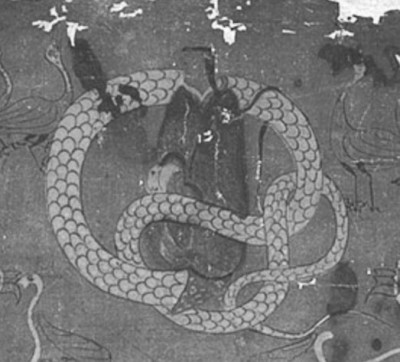 人首蛇身的形象,也见于著名的马王堆汉墓T形帛画。更为人所知的人首蛇身神,是伏羲和女娲。不过,在先秦文献中,关于伏羲和女娲的记载极少,关于其样貌,难以详考。战国时期的子弹库楚帛书讲述了“太一伏羲”创世的故事,但并未涉及其形象。关于伏羲和女娲人首蛇身形象的材料,见于西汉以来的文献和图像。东汉王逸在注释《楚辞·天问》“女娲有体,孰制匠之”一句时说:“传言女娲人头蛇身,一日七十化。”王逸之子王延寿所作《鲁灵光殿赋》云:“伏羲鳞身,女娲蛇躯。”可见,东汉时人已经明确认为伏羲、女娲是人首蛇身。一般认为是魏晋时期成书的《列子·黄帝》称“庖牺氏、女娲氏,神农氏、夏后氏蛇身人面,牛首虎鼻”。西晋皇甫谧所作《帝王世纪》,称伏羲和女娲都是“蛇身人首”。后来唐人司马贞给《史记》补《三皇本纪》,亦称伏羲“蛇身人首”。人首蛇身的伏羲、女娲形象,在两汉时期的壁画和画像石中颇为常见,这一主题的绢画在隋唐时期曾一度流行于新疆地区。至于西汉之前伏羲、女娲是什么形象,目前尚缺乏直接的材料。