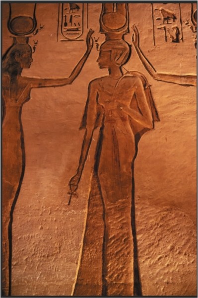 但是,古代埃及人并非不重细节和写实。现存的神庙和墓穴壁画展示,他们在刻画动物的头颅时时常表现出高度的真实感和写实技艺,在细节处理中不仅追求逼真性,而且表现出其对细腻、幽妙的精心追求。以塞特一世墓的梯井C悬楣上的伊西斯女神像为代表,新王朝时代在描绘这位母亲女神及墓穴守护神时,是以一位优美的少女为理想形象的——她半跪的身躯纤细而柔美。而在阿布辛贝小神庙中,尼菲尔苔莉王后的身姿同样被描绘出动人的婉约和曼妙,两侧为她赐福的哈索尔女神的纤柔手指也别具韵致。