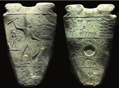 古代埃及人在彩绘浮雕壁画中,大量采用简约、抽象和夸张的造型手法。神、人和动物的大小比例,是根据宗教和权势观念而任意决定的。这样的形象观念从距今5000年,即古代埃及的谛造者孟菲斯国王时代就确定下来。被称为“最古老的埃及历史记录”的《那尔迈调色板》(Narmer Palette),大约制造于公元前3200-3000之间。它双面使用浅浮雕描绘那尔迈国王征战敌人并统一上、下埃及的故事。在正面,那尔迈国王被描绘为头戴上埃及的白王冠,左手揪着一个跪地的敌人的头发,右手高举权杖的形象。那尔迈的形体巨大,从上到下充斥画面。他的头部、双腿和双脚侧面朝向右前方,而躯干是正面的。这种同体异面的描绘方式,有利于更完整地呈现人物形体。与之相比,不仅被打击的敌人和身后的随从,而且无论是画面顶部两个人面牛角的哈索尔女神,还是那迈尔右手上方的荷鲁斯神,都微小。在背面,上部描绘戴着下埃及红王冠的那迈尔正在巡视他的战胜品(俘虏和财物),其形体较正面形象缩小;中部描绘两支蛇豹(serpopard)交颈构成一个圆环,而它们高昂的头被两个带胡须的男子勒住。这个画面表示上下埃及的统一,而两个勒住豹头的男子,应当是那迈尔的分形化身。从这个盾形画盘可见,古埃及人根据宗教和政治观念,夸张、抽象、变形和分形,从而强化或弱化描绘对象。
