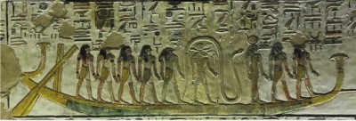 在塞特一世陵墓(Tomb of Se⁃ti I,V17)的楼梯间有一幅浅浮雕壁画,描绘太阳神拉带领着哈索尔女神和塞特神及六位法老(神祇?)乘太阳船渡过地下黑夜的第十个时辰。太阳神在地下渡过黑夜,其神像就变为人身、山羊头,头顶是闪着光芒的太阳,右手提着象征生命的神符,左手持着装饰着抽象兽头的神杖。太阳神的妻子哈索尔女神,则人身人面,头顶着两支牛角夹着的太阳盘——她在地下航行中是“太阳神之眼”,所以站在太阳神的前面。人身鹰头的塞特神(Set)本是荷鲁斯的死敌,代表着暴力和混乱。但在地下,他成为太阳神渡过黑夜之河的护卫者——地下的邪恶之蛇阿培匹(Apep)总是企图阻挡太阳神的太阳船前行,塞特与之鏖战,护卫太阳船顺利航行。这幅壁画将9个神-人一字并排在太阳船上,全部躯体正面,头部向左侧面,双脚也向左侧面。图像的描绘是简略而且几何化的。阻挡太阳神的恶蛇阿培匹被几何化为两个上下倒置相连的U字,而其头却是被具象逼真地刻画出来的。