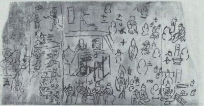 第二章讨论与壁画绘制有关的三类画稿。这些画稿多与莫高窟和榆林窟中15个归义军时期营建的洞窟有关。一为示意图,分片分组概括性地描绘带叙事情节的场面,有时使用文字或数字标注不同场面在壁画上的最终位置(图一)。二为细节图,是对某些人物面部、身体及动作的特写(图二)。三为刺孔,图样表面带有孔洞,通过扑粉可以在壁面留下粉点以辅助人物绘制(图三)。画师借助示意图和细节图,在不使用工具的情况下,徒手进行壁画创作。随时依据壁面尺寸,调整场景大小及人物比例。这种创作方式比缩放整幅画稿更适应于空间变化复杂的洞窟壁画绘制。刺孔以千佛图像为主,多用于窟顶装饰工程。这些图像所处的石窟空间及装饰,经常模仿墓葬或地面寺院。受多开间木构建筑影响,归义军时期常将石窟壁面划分成多个区间进行壁画绘制。这种图像配置方式,进一步强化了各个洞窟间的相似性。作者指出本章所讨论的15个石窟,壁画内容的相似之处并非源于对整幅画稿的等比缩放,而是整个绘制活动程式化的产物。