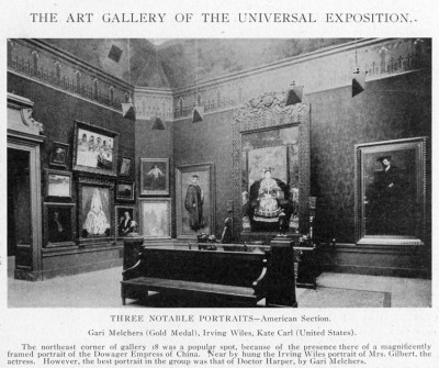1904年,慈禧从卡尔绘制的油画像中精心挑选出一幅,并配以极大紫檀木外框,画框上雕饰精美的寿字团纹和龙纹图案,两层基座外加画框底边构成的基座近一人高,使得观瞻者必须仰视画中高居宝座上的慈禧。为了运输这幅在世统治者的肖像,有英文报道称,慈禧特别下令修了一条铁路,以区别于一般由担夫手抬遗像的运送方式。官员一路恭迎“圣像”,三拜九叩如见慈禧真人,之后以绣龙纹织锦仔细包裹着即使在运输过程中也不允许头脚颠倒的圣容,远渡重洋将之“恭请”至美国世博会(图1)。这是中国在世统治者的肖像第一次主动、正式向西方观众展出。事实上,慈禧在画像之初就已经明确她的预设观众是“美国人民”,慈禧明确知道卡尔这次画像的用途:由慈禧本人从中选出一幅油画“圣容”送到世博会,向外国人展出。