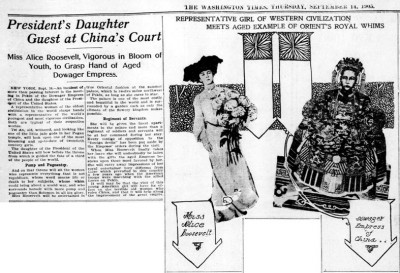 1908年6月20日的法国《画报》封面刊登了一幅慈禧的彩色石版画肖像。画面上,慈禧梳大拉翅头,手持中式折扇,端坐于欧式宝座上,背景是凤穿牡丹屏风,屏风上有“大清国当今圣母皇太后万岁万岁万万岁”的横幅,落款时间是光绪癸卯年(1903年)。这张版画与慈禧赠予美国总统女儿的一张照片十分类似。1905年9月,美国总统女儿爱丽丝·罗斯福(Alice Roosevelt)访华,慈禧接见了她,并将这张照片作为礼物赠送给爱丽丝。《圣容帐》中记载慈禧有一版“梳头穿花卉拿折扇圣容”照片被冲印了60张,根据字面描述,并通过图像对比排除其他现存可见照片,可以判断“梳头穿花卉拿折扇圣容”指的就是慈禧送给爱丽丝的这一版照片。法国《画报》封面版画应当也是在这一版照片基础上着色绘制的。