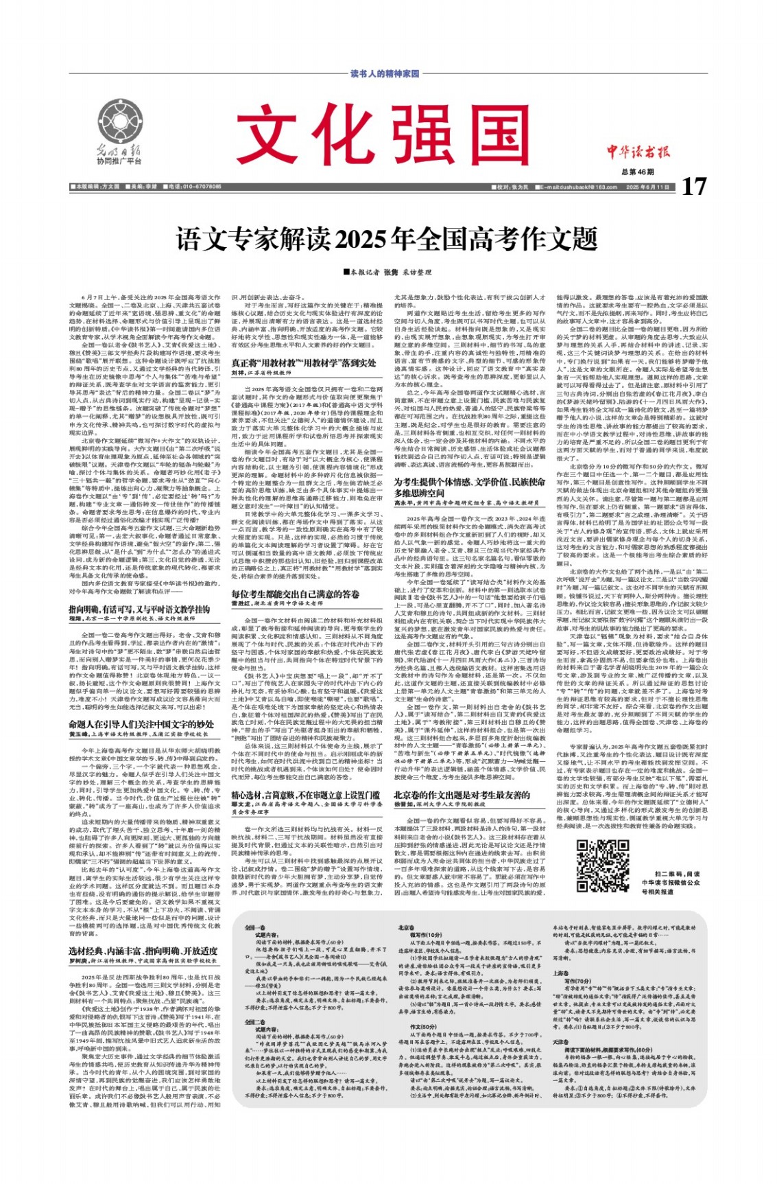 6月7日上午,备受关注的2025年全国高考语文作文题揭晓。全国一、二卷及北京、上海、天津共五套试卷的命题延续了近年来“宽语境、强思辨、重文化”的命题趋势,在材料选择、命题形式与价值引导上呈现出了鲜明的创新特质。《中华读书报》第一时间邀请国内多位语文教育专家,从学术视角全面解读今年高考作文命题。