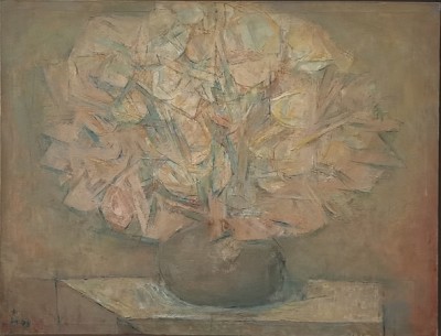 以这些素描为范例,鲜明的几何性是赵大钧数十年来艺术探索的主线。作于1994年的《花》就颇具毕加索分析立体主义的精神。作品使用低调内敛的颜料,似乎刻意淡化色彩的存在感,反而着力突出桌面、花瓶和花束的几何形。这些被描绘的物象线条棱角十分突出,长方形、圆形、三角形、五边形等图案被复杂地编织在一起,共同塑造出“花”的内外轮廓,让整个画面产生一种刀砍斧剁般的刚毅气质。《神山仙乃日》也是如此,画面的高光部分呈现出一条隐隐约约的对角线,也将“山”开辟为近似于一朵白玫瑰的花形,此“花”亦与彼《花》相仿,因为几何性质的突出而全无娇弱之态,反而独具一种傲世独立的坚韧生机。