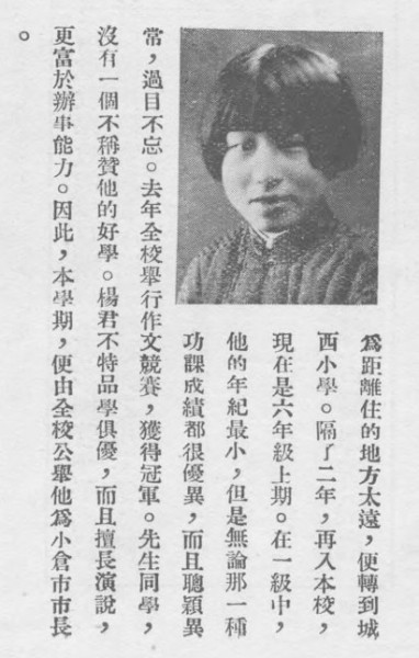杨必,年十二岁,江苏无锡人。六岁入本校(苏女师小)幼稚园,后来因为距离住的地方太远,便转学到城西小学。隔了二年,再入本校。现在是六年级上期。在一级中,她的年纪最小,但是无论哪一种功课,成绩都很优异,而且聪颖异常,过目不忘。去年全校举行作文竞赛,获得冠军。先生、同学,没有一个不称赞她的好学。杨君不特品学俱优,而且擅长演说,更富于办事能力。因此,本学期,便由全校公举她为小仓市市长。