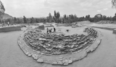积石冢遗址北侧圆形建筑直径23.5米,外冢界墙在北部圆冢近半处向南延伸围绕呈方形;南部方形建筑长约45米。内冢界墙呈圆形围绕中部冢体一周,冢体残存0.4—2米,可见一至七层台阶状墙体自内冢界墙内侧向冢体中部层层内收似金字塔状,墙体由于长时间挤压,整体向外倾斜。台阶状墙体上、冢墙墙根下皆摆放无底筒形器。但由于晚期堆积、挤压、破坏使得墙体上部摆放的筒形器倾倒跌落,部分残片保留在墙体堆积中。其中保存较好的北部墙体处可见原位保存的无底筒形器约有90个,根据筒形器的口径计算,围绕一圈大约可摆放200余件,绝大部分都带有黑彩带。北部的内圈冢界墙上部分区域还可见到原位摆放的扁钵式筒形器。南部的南坛结构相比较为简单,与圆形积石冢有机结合。坛体东、西两侧的墙体是由外圈冢界墙延续形成。外圈冢界墙在半圆处向南延伸时形成直墙,直墙的结构也与北部的冢界墙明显不同。墙宽约2.35米。西侧墙体破坏严重,部分已经露出地表,石块不存。而东部墙体已发掘部分长27米,向南则叠压在一处清代遗存下,最南部经勘探和试掘可知全长约45米。两墙内部间距20.3米,由此可推算其坛内活动面积约六七百平方米。